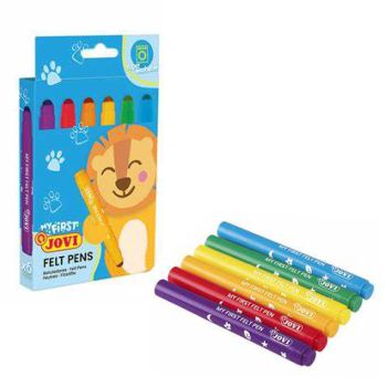 Caja de 6 rotuladores "MY FIRST FELT PENS" de JOVI. Son facilmente lavables con punta redonda de 7.5mm y antihundimiento. Colores vivos. Para a partir de 12 meses de edad.